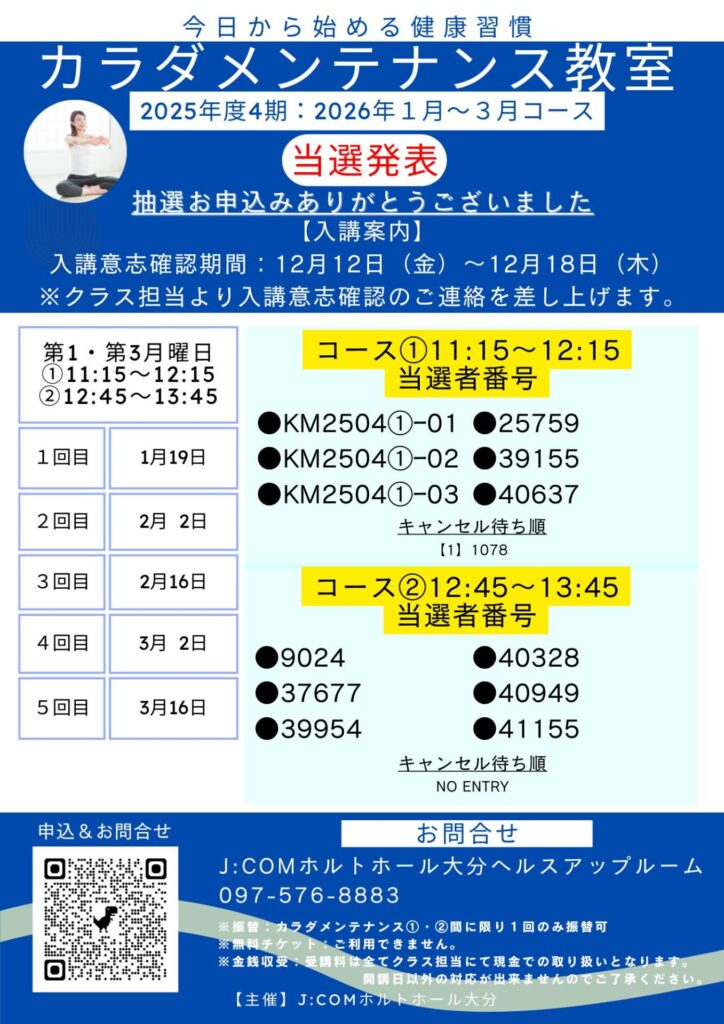 【運動教室②】2026年1月~3月開催運動教室{カラダメンテナンス教室} 抽選結果発表